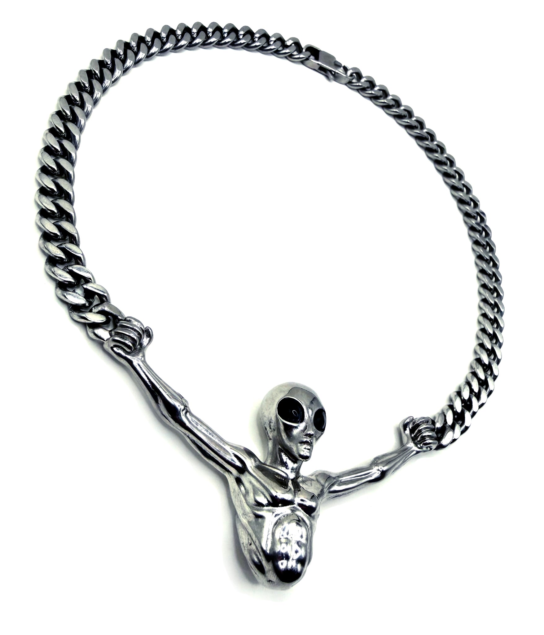 Not subtle—and not meant to be. This stainless steel statement piece features a sculpted alien figure gripping the chain across the neck, creating the illusion that it’s holding everything together. Bold, futuristic, and unapologetically eye-catching, this necklace is made for those who like their accessories to start conversations.